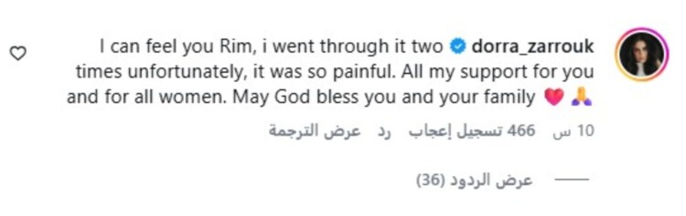 وفي تعليقها على منشور ريم، كتبت: “أشعر بكِ يا ريم، لقد مررت بهذه التجربة مرتين للأسف، وكان الألم قاسيًا جدًا. كل دعمي لكِ ولكل النساء… الله يحميك ويحمي عائلتك.”