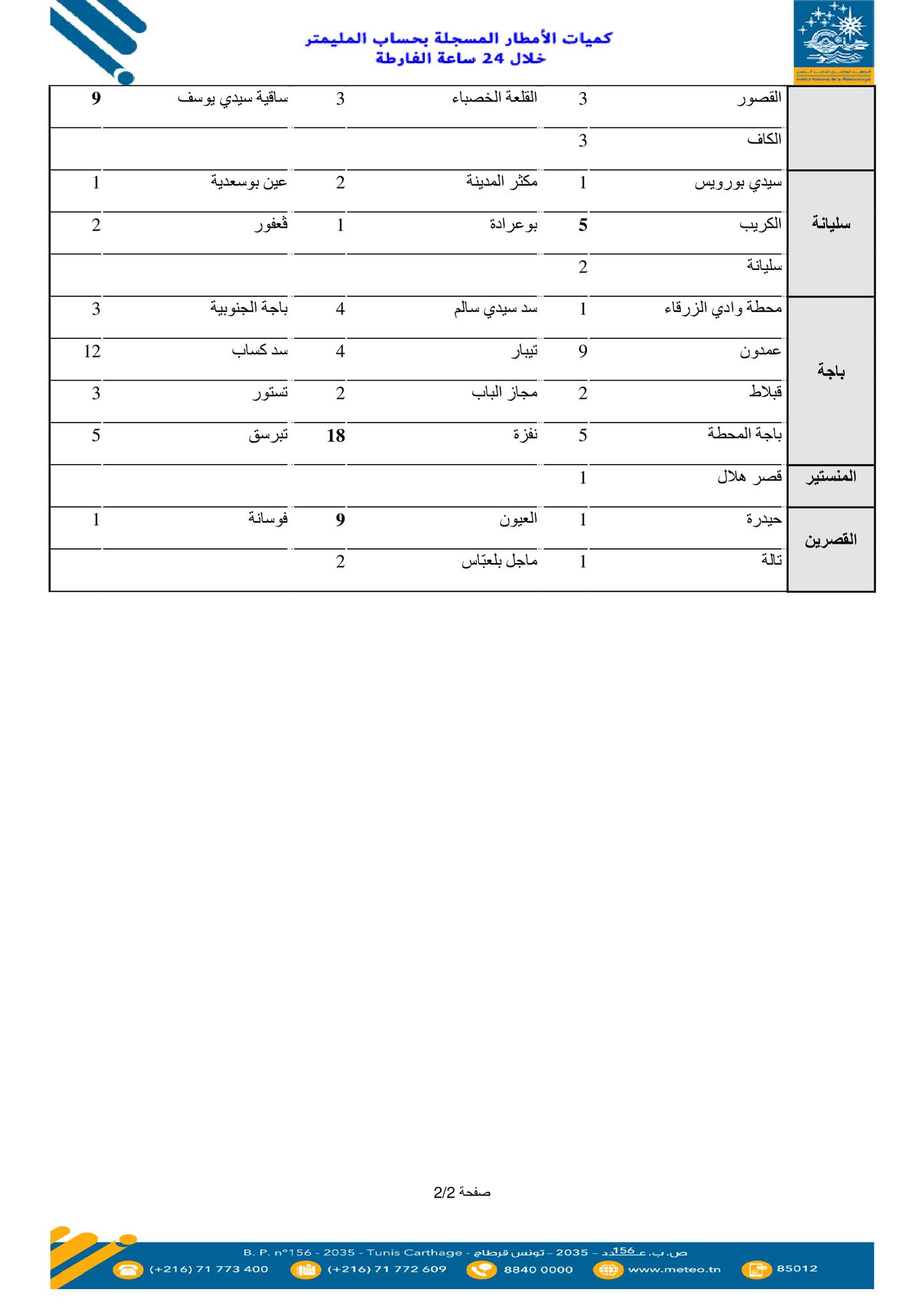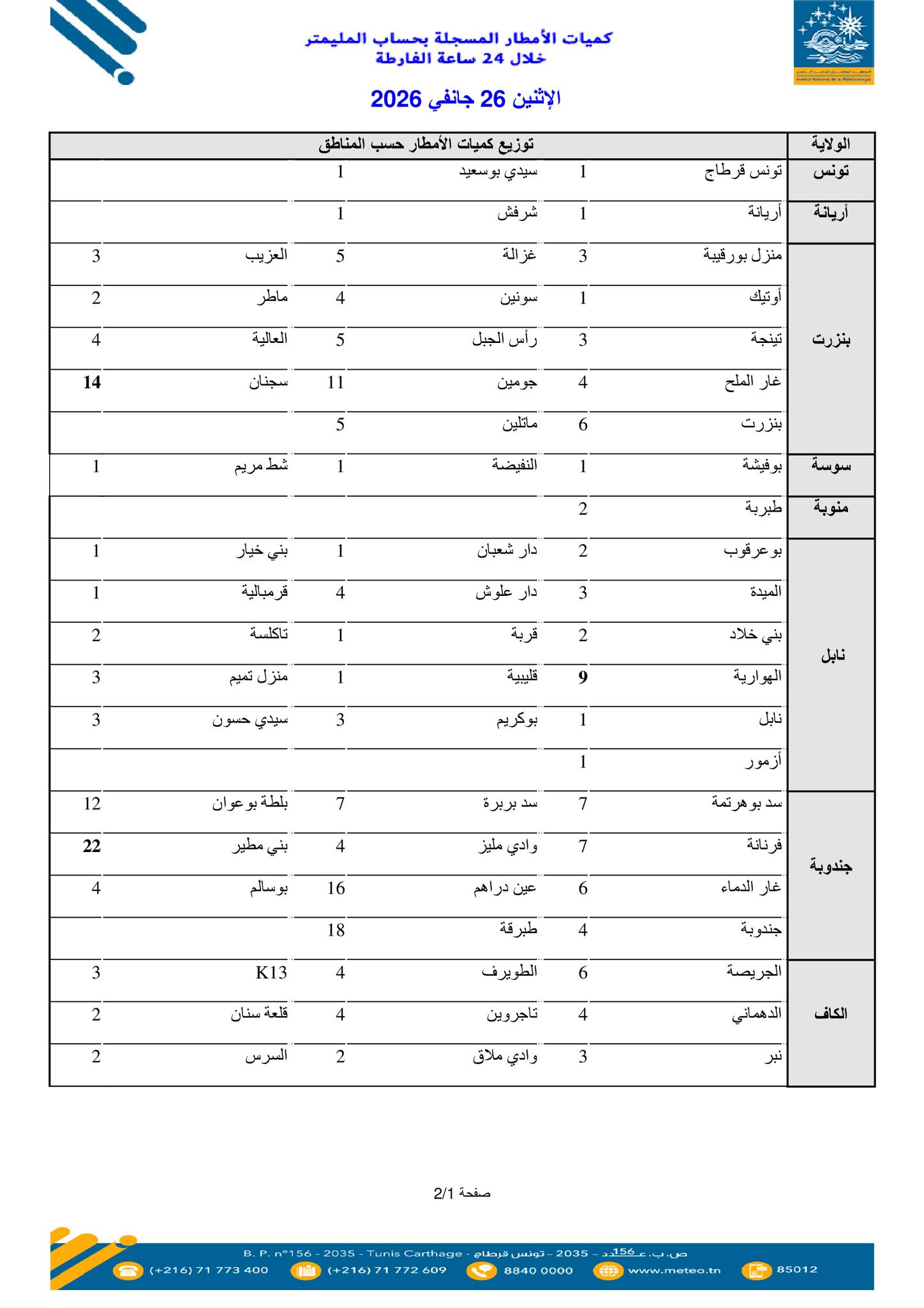 نشر المعهد الوطني للرصد الجوي، اليوم الإثنين 26 جانفي 2026، على صفحته الرسمية على فايسبوك، قائمة لكميات الأمطار المسجلة من يوم الأحد 25 جانفي 2026 على الساعة 07 صباحا إلى يوم الاثنين 26 جانفي 2026 على الساعة 07 صباحا: