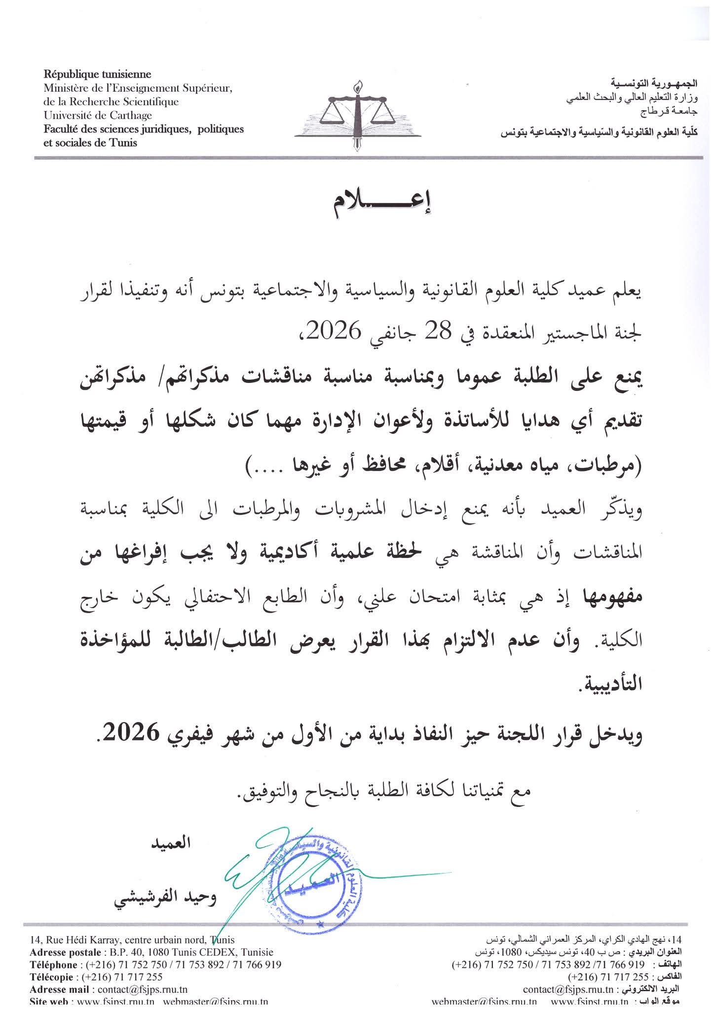 أصدرت كلية العلوم القانونية والسياسية والاجتماعية بتونس، بلاغا لها اليوم الخميس 29 جانفي 2026، أعلنت فيه عن منع تقديم الهدايا للأساتذة وأعوان الإدارة مهما كان شكلها أو قيمتها(مرطبات، مياه معدنية، أقلام...)، بمناسبة مناقشات الطلبة لمذكراتهم، كما ذكّرت بمنع إدخال المشروبات والمرطبات للكلية بمناسبة المناقشات.
