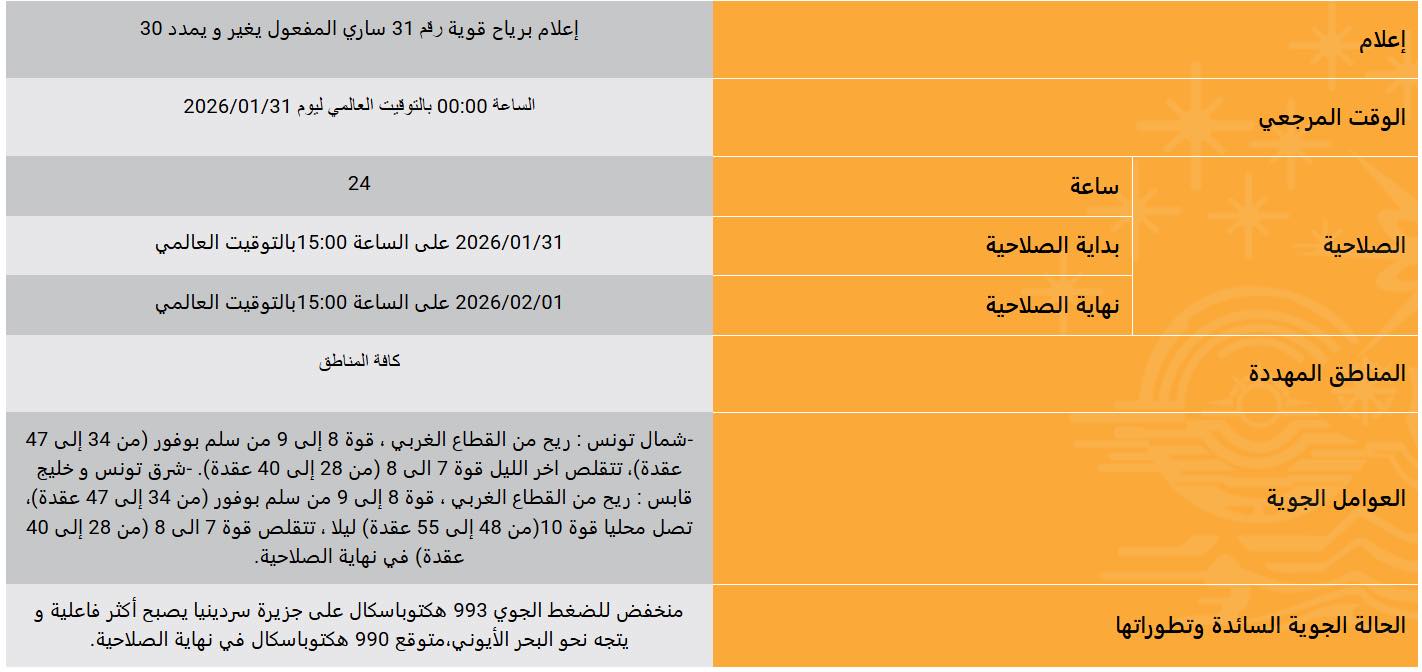 أعلن المعهد الوطني للرصد الجوي السبت 31 جانفي 2026، في نشرة بحرية خاصة عن هبوب رياح قوية يشمل كافة المناطق .
